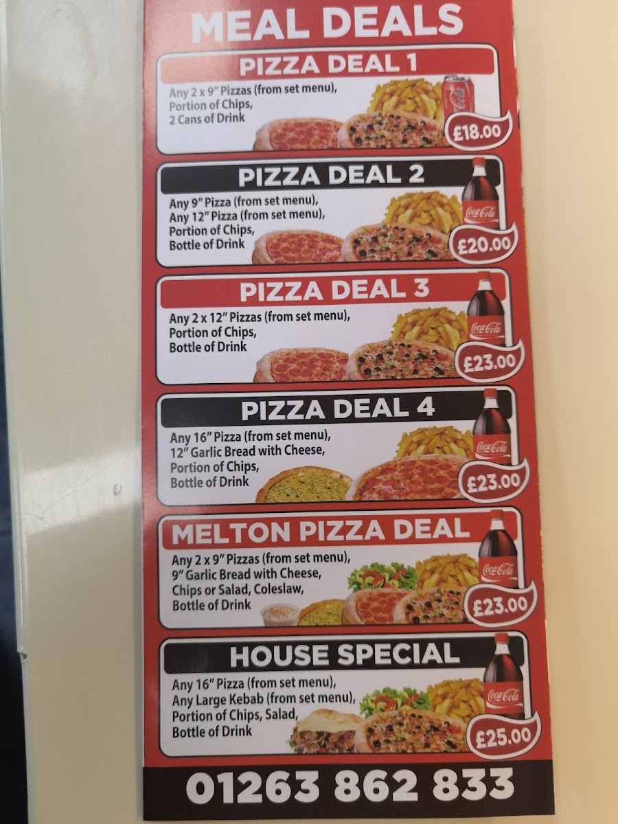 Located at 43 Briston Rd, Melton Constable, Melton Pizza & Kebabs offers a diverse menu celebrating the best of takeaway cuisine. Renowned for its expertly crafted pizzas—including a delightful Pepperoni and hearty BBQ Chicken—and a tantalizing range of kebabs, such as the succulent Lamb Doner and flavorful Veggie Kebab, this eatery is a local favorite. Customers rave about both the exceptional taste and the exceptional service. With a commitment to quality and freshness, Melton Pizza & Kebabs delivers delicious, satisfying meals that promise to exceed your expectations. Perfect for a casual dinner or a satisfying takeaway experience!